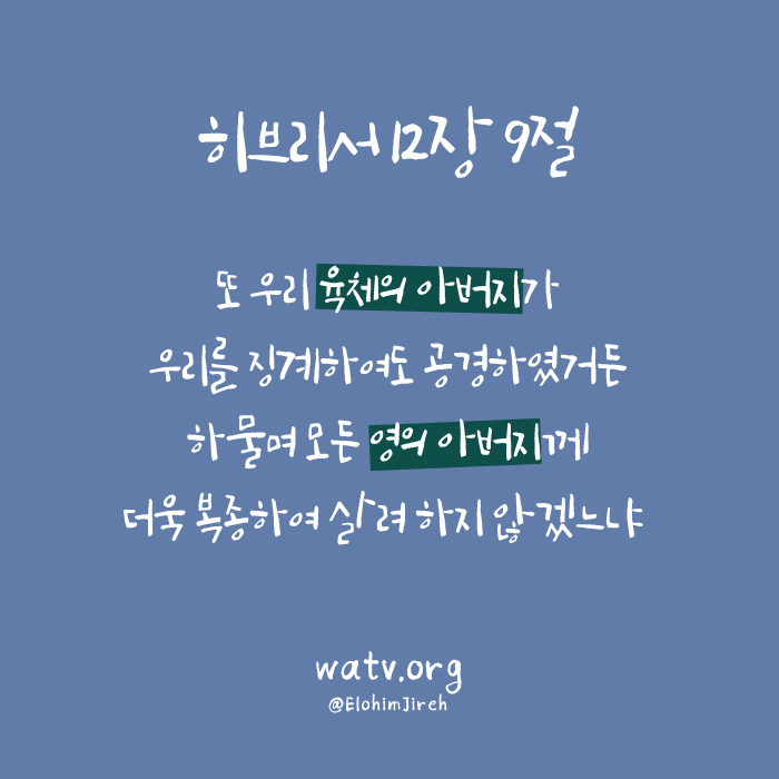 히브리서 12장 9절 우리 육체의 아버지가 우리를 징계하여도 공경하였거든 하물며 모든 영의 아버지께 더욱 복종하여 살려 하지 않겠느냐