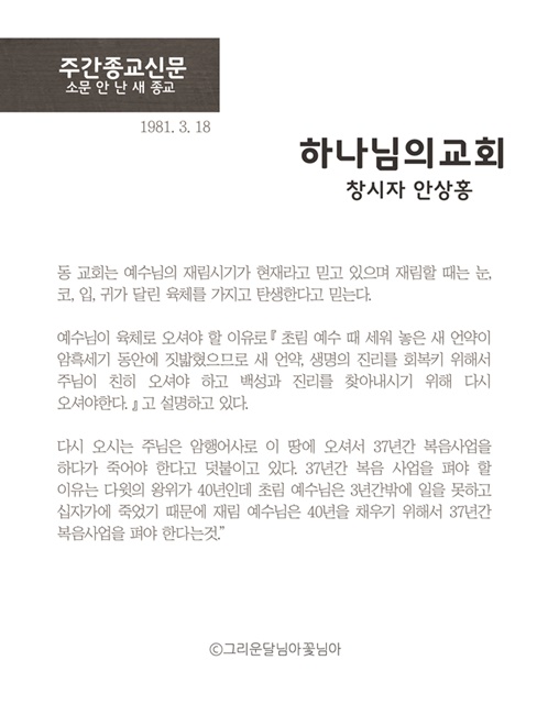 | 안상홍님 약력 1918년 성탄 1948년 30세 되던 해에 침례받으심 1985년 37년간 다윗의 증표인 새 언약 유월절 전파하시고 하늘로 올리우심 37년 정한 기간 동안 복음 사역을 마치시고는 하늘로 올라가실 것도 4년 전에 미리 알려주셨습니다 1981년 3월 18일자 주간종교 신문 |