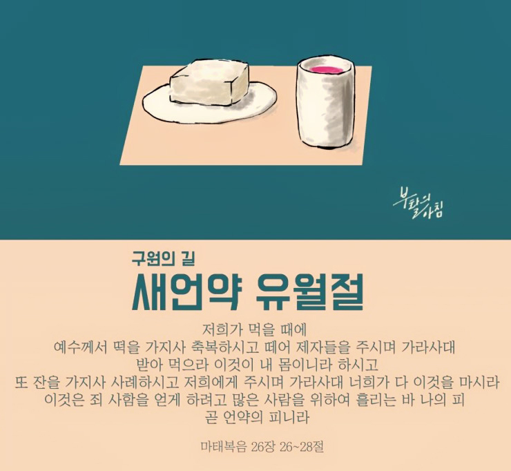 저희가 먹을 때에 예수께서 떡을 가지사 축복하시고 떼어 제자들을 주시며 가라사대 받아 먹으라 이것이 내 몸이니라 하시고 또 잔(포도주)을 가지사 사례하시고 저희에게 주시며 가라사대 너희가 다 이것을 마시라 이것은 죄 사함을 얻게 하려고 많은 사람을 위하여 흘리는 바 나의 피 곧 언약의 피니라