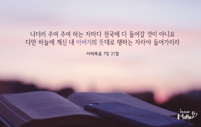 나더러 주여 주여 하는 자마다 천국에 다 들어갈 것이 아니요 다만 하늘에 계신 내 아버지의 뜻대로 행하는 자라야 들어가리라
