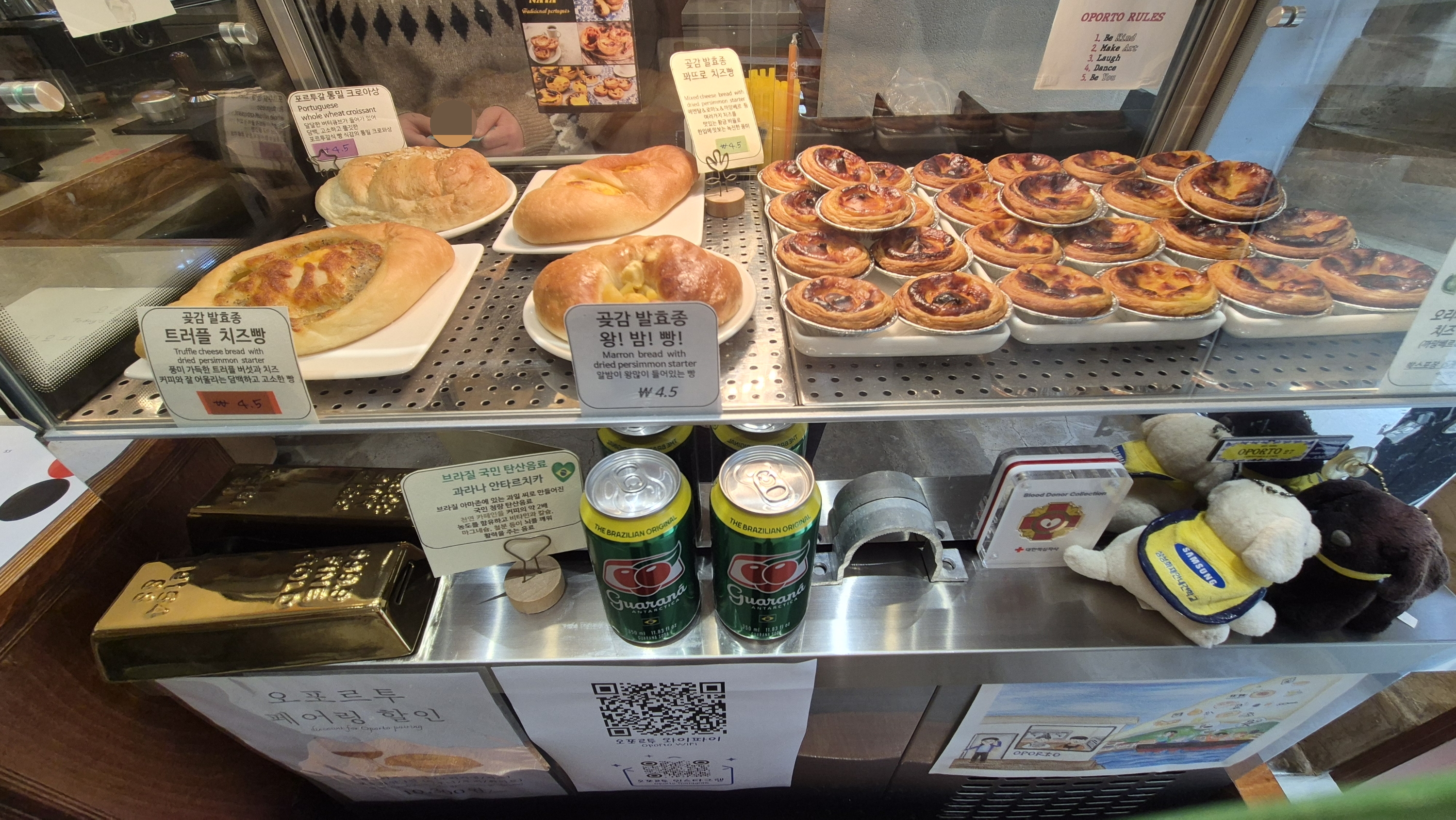 부산역 근처포르투갈식 에그타르트가 있다고 해서점심시간에 찾아가봤어요ㅎㅎㅎ카페가 깔끔하니 좋아요처음 계단 오르기 좀 벅찼네요운동부족 😆 ㅋㅋㅋ두번째 계단 오르기 전에 🍞 간판이 있어서 너무 다행ㅋㅋ안에 앉을 수 있는 자리도 있고요엽서 기념품도 판매하고 있더라구요에그타르트와 커피, 빵을 판매하는것 같아요곶감 발효종 왕밤빵 / 곶감 발효종 꽈트로 치즈빵곶감 발효종 트러플 치즈빵 / 포르투갈 통밀 크루아상브라질국민탄산음료 과라나안타르치카오리지날 치즈맛오리지날 , 치즈맛 에멘탈, 까망베르종류가 있어요포르투갈 브라질 빵과 디저트 커피부산역1번 출구에서 10분정도 걸으면 됐던거 같아요에그타르트가 포르투갈 리스본의 레시피인줄 몰랐네요ㅋㅋ 새롭게 알았어요오포르투는 라는 뜻이네요~~판매 당일 빵을 굽으니 신선하고..