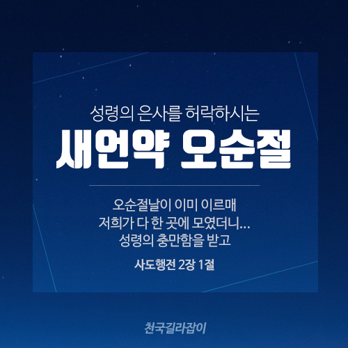 오순절날이 이미 이르매 저희가 다 한곳에 모였더니 홀연히 하늘로부터 급하고 강한 바람 같은 소리가 있어 저희 앉은 온 집에 가득하며 불의 혀 같이 갈라지는 것이 저희에게 보여 각 사람 위에 임하여 있더니 저희가 다 성령의 충만함을 받고 성령이 말하게 하심을 따라 다른 방언으로 말하기를 시작하니라