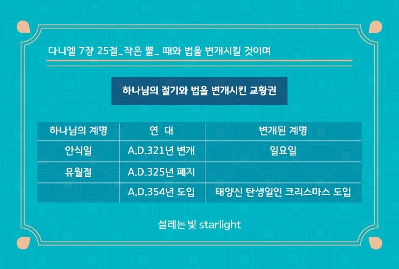 안식일이 AD321년 폐지 일요일예배 확립, 유월절이 AD325년 폐지, AD354년 태양신 탄생일인 크리스마스 도입